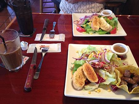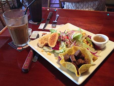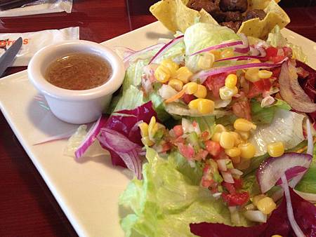 可能我們點的是沙拉, 沒很久就送上了, 這是我的牛排塔可沙拉 ($309, 套餐), 份量不小喔