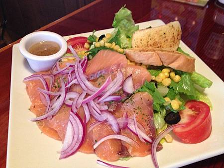 接著朋友的燻鲑魚沙拉也來了, 厚 好多的燻鲑魚啊, 而這附的沙拉跟我的沙拉是不一樣的