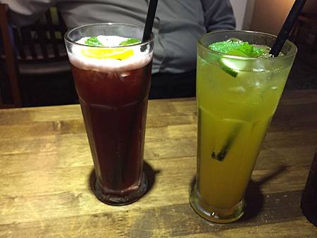飲料很快就上, 都是水果蘇打, 都好大杯, 減了糖度後喝起來並不會特別酸, 反而更搭配後來上的油膩膩漢堡