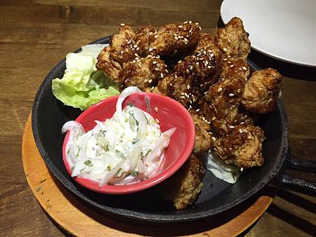 套餐中可選擇的雞米花, 我以為是炸過後加醬碳烤, 朋友說這應是韓式的, 一旁白白的不是cole slaw而是生洋蔥沙拉, 反正好吃就是
