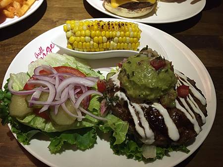 這個怪怪的是酪梨莎莎牛肉堡, 配菜式碳烤玉米, 之所以看起來怪是我們無意煎在菜單的附註中看到可以選加量生菜取代麵包, 好棒喔! 但後來這樣吃有2個缺點, 因為難著力,兩支手都會一直髒兮兮,而且料肉醬汁會亂掉..., 再則, 沒有麵包吸附醬汁的漢堡排, 吃起來沒那麼美味呀