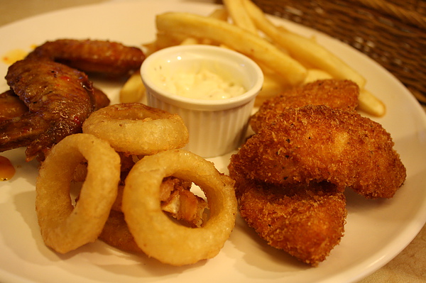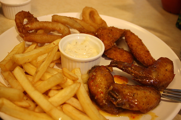 我們先點了拼盤, $250, 炸薯條、洋蔥圈、雞翅與炸雞柳, 除炸雞柳稍嫌硬了點, 每一樣都不錯,