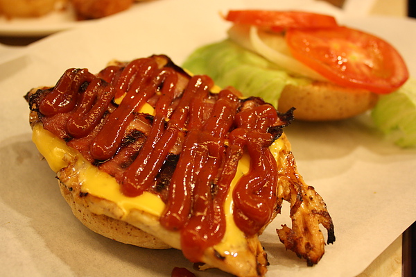 招牌燒烤雞肉堡 $195, 上面覆蓋二片培根