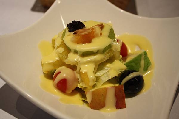 今天的沙拉"水果優格沙拉", 真是漂亮又好吃 (水果真多, 有鳳梨、蘋果、楊桃、芭樂, 還有蔬菜)
